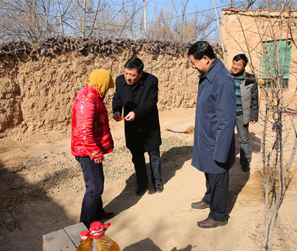 2015年2月6日,公司黨委書(shū)記、董事長(zhǎng)薛季民、紀(jì)委書(shū)記、工會(huì)主席王曉燁帶領(lǐng)公司有關(guān)人員,前往省級(jí)“兩聯(lián)一包”定點(diǎn)扶貧村——澄城縣趙莊鎮(zhèn)高塬村扶貧慰問(wèn),為該村特困家庭和困難戶(hù)送去大米、食用油和慰問(wèn)金等,并帶去公司全體員工的親切關(guān)懷及節(jié)日祝福。