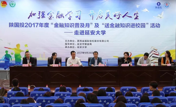 為積極落實(shí)《中國(guó)銀監(jiān)會(huì)辦公廳關(guān)于組織開(kāi)展2017年“金融知識(shí)進(jìn)萬(wàn)家”宣傳服務(wù)月活動(dòng)的通知》和《關(guān)于開(kāi)展2017年度陜西省“送金融知識(shí)進(jìn)校園”的活動(dòng)的通知》,9月28日公司總裁助理孫西燕帶隊(duì),財(cái)富管理總部副總經(jīng)理惠利等一行人走進(jìn)革命紅區(qū)延安大學(xué),在學(xué)校圖書(shū)館報(bào)告廳為300余名師生舉辦了“金融知識(shí)普及月”及“金融知識(shí)進(jìn)校園”活動(dòng),并赴革命紅區(qū)呼家川村舉辦了金融知識(shí)宣傳及觀影活動(dòng)。