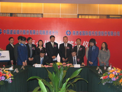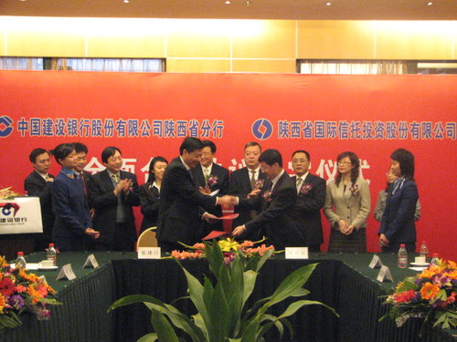 2007年2月12日下午,我公司與中國(guó)建設(shè)銀行股份有限公司陜西省分行在喜來(lái)登大酒店簽署了《全面合作協(xié)議書(shū)》,拉開(kāi)了兩家單位在21個(gè)方面進(jìn)行全面合作的帷幕。公司黨委書(shū)記、董事長(zhǎng)薛季民、黨委副書(shū)記兼紀(jì)委書(shū)記黎惠民、副總裁何熙平、副總裁趙輝、總會(huì)計(jì)師李玲及信托部門(mén)有關(guān)人員等參加了簽字儀式。建設(shè)銀行陜西省分行行長(zhǎng)曾益、副行長(zhǎng)魏承國(guó),省分行機(jī)構(gòu)業(yè)務(wù)部總經(jīng)理于卉、省分行個(gè)人金融業(yè)務(wù)部總經(jīng)理?xiàng)罾竦瘸鱿炞謨x式。薛季民董事長(zhǎng)、曾益行長(zhǎng)先后發(fā)表了熱情洋溢的講話(huà),共同祝愿雙方取得實(shí)質(zhì)性合作,實(shí)現(xiàn)雙贏。