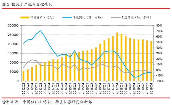 從2018年一季度開(kāi)始,信托資產(chǎn)規(guī)模連續(xù)8個(gè)季度下滑。究其原因,一方面與監(jiān)管的收緊有關(guān),倒逼信托公司主要壓縮通道業(yè)務(wù)規(guī)模,持續(xù)向回歸信托本源、服務(wù)實(shí)體經(jīng)濟(jì)、強(qiáng)化主動(dòng)管理能力的方向轉(zhuǎn)變;另一方面,也與宏觀經(jīng)濟(jì)增速持續(xù)下臺(tái)階有關(guān),信用風(fēng)險(xiǎn)抬升,信托公司獲取合適資產(chǎn)的難度加大。到了2019年,這兩個(gè)因素依然存在,不過(guò)政策帶來(lái)的影響在邊際上有所改善。在經(jīng)濟(jì)下行壓力增大的背景下,宏觀政策逐步轉(zhuǎn)向“穩(wěn)增長(zhǎng)、穩(wěn)杠桿”,“寬貨幣+寬信用”的政策組合使得經(jīng)濟(jì)增速預(yù)期好轉(zhuǎn),融資需求有所回暖。同時(shí),央行關(guān)于資管業(yè)務(wù)的通知允許銀行自主制定整改計(jì)劃,有助于穩(wěn)定銀信合作中的銀行表內(nèi)和表外的資金規(guī)模,避免銀信合作規(guī)模過(guò)快下降。銀行理財(cái)可投非標(biāo)的明確規(guī)定將消除監(jiān)管不確定性,非標(biāo)資金端的改善有望帶來(lái)銀信融資類(lèi)業(yè)務(wù)降幅趨緩。部分存量信托產(chǎn)品具有資金池特征,資管新規(guī)過(guò)渡期內(nèi)允許資金池類(lèi)信托產(chǎn)品滾動(dòng)發(fā)行對(duì)接新資產(chǎn),有利于減緩信托規(guī)模的下降。這些積極因素推動(dòng)下,使得信托規(guī)模壓降的速度在2019年上半年有所放緩。不過(guò)在2019年下半年,對(duì)于通道業(yè)務(wù)和房地產(chǎn)信托的監(jiān)管加碼,通道業(yè)務(wù)和房地產(chǎn)信托業(yè)務(wù)均受到比較大的影響,信托規(guī)模壓降的速度重新擴(kuò)大。