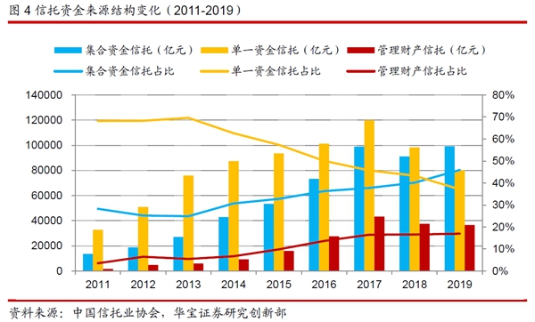 與此同時(shí),為適應(yīng)監(jiān)管政策變化,信托公司業(yè)務(wù)開(kāi)展逐步轉(zhuǎn)型,普遍加強(qiáng)財(cái)富渠道建設(shè),增強(qiáng)主動(dòng)管理能力,集合資金信托占比穩(wěn)定上升。2019年末,存量集合資金信托規(guī)模9.92萬(wàn)億,規(guī)模較年初增加8121億元,規(guī)模占比由年初的40.12%提升到45.93%。