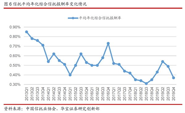 從上述兩個(gè)角度來(lái)分析信托產(chǎn)品的結(jié)構(gòu)我們可以發(fā)現(xiàn),“資管新規(guī)”落地后,通道與多層嵌套業(yè)務(wù)不斷清理與壓縮,信托公司主動(dòng)管理能力增強(qiáng),信托業(yè)務(wù)結(jié)構(gòu)優(yōu)化。這帶動(dòng)了信托報(bào)酬率從2018年四季度開(kāi)始連續(xù)3個(gè)季度的回升,2019年二季度平均年化綜合報(bào)酬率為0.54%,相對(duì)于2018年三季度的階段性低點(diǎn)提高0.23個(gè)百分點(diǎn)。不過(guò)由于2019年下半年監(jiān)管部門(mén)加大了風(fēng)險(xiǎn)排查的力度和頻率,之前被隱匿的風(fēng)險(xiǎn)得到了更加充分的暴露,使得信托報(bào)酬率在下半年出現(xiàn)了回落。