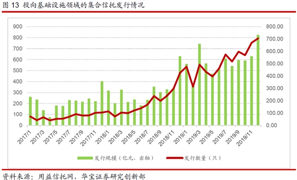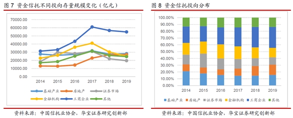 2019年末,投向基礎(chǔ)產(chǎn)業(yè)的信托規(guī)模為2.82萬(wàn)億,較2018年末增加565億元,規(guī)模占比為15.72%,上升1.13個(gè)百分點(diǎn)。去年四季度《國(guó)務(wù)院辦公廳關(guān)于保持基礎(chǔ)設(shè)施領(lǐng)域補(bǔ)短板力度的指導(dǎo)意見(jiàn)》出臺(tái),提示地方政府化解隱性債務(wù)風(fēng)險(xiǎn),防范出現(xiàn)系統(tǒng)性金融風(fēng)險(xiǎn),增強(qiáng)了金融機(jī)構(gòu)對(duì)平臺(tái)公司融資的信心,信政合作業(yè)務(wù)迎來(lái)政策“拐點(diǎn)”。隨著中美貿(mào)易摩擦的持久化,面對(duì)國(guó)內(nèi)外風(fēng)險(xiǎn)挑戰(zhàn)明顯增多的復(fù)雜局面,作為國(guó)家逆周期調(diào)節(jié)的重要手段,2019年政策一直推進(jìn)基建投資的回升,基礎(chǔ)產(chǎn)業(yè)融資需求有所回升。