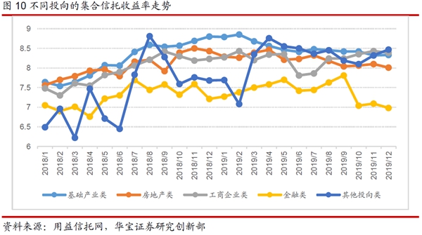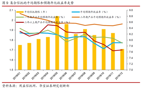 產(chǎn)品收益:根據(jù)用益信托網(wǎng)不完全數(shù)據(jù)顯示,2019年,已公布的集合理財(cái)類(lèi)信托產(chǎn)品的平均收益率為8.16%,與2018年相比平均收益率上行22個(gè)bp;其平均信托年限為1.86年,與2018年持平。從預(yù)期年化收益率的趨勢(shì)來(lái)看,2019年月度新發(fā)集合信托平均預(yù)期年收益率呈明顯的下降趨勢(shì)。疫情加大經(jīng)濟(jì)衰退風(fēng)險(xiǎn),全球流動(dòng)性大幅投放,“資產(chǎn)荒”的壓力進(jìn)一步增大,預(yù)計(jì)2020 年集合信托產(chǎn)品的平均預(yù)期收益率仍然有一定的下行空間。