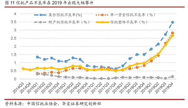 不良率快速攀升。具體來(lái)看,信托整體的不良率由2018年末的0.98%上升至2019年末的2.67%,不良率上升1.69個(gè)百分點(diǎn);集合信托的不良率由2018年末的1.51%上升至2019年末的3.48%,上升了1.97個(gè)百分點(diǎn);單一資金信托的不良率由2018年末的0.83%上升至2019年末的2.82%,上升了2個(gè)百分點(diǎn)。2019年單一資金信托的不良率上升的比集合信托要快,不過(guò)當(dāng)前集合信托的不良率仍高于單一資金信托。