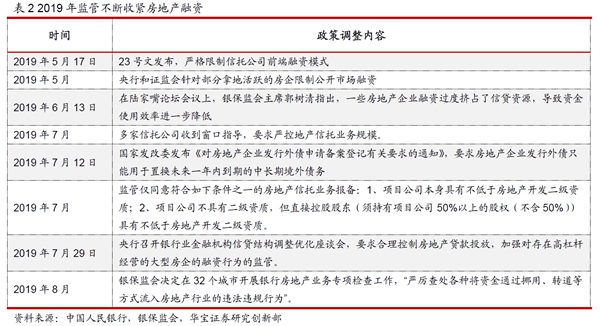2016年國(guó)慶之后,盡管房地產(chǎn)調(diào)控政策不斷收緊,但是地產(chǎn)投資受到的影響比較小,地產(chǎn)投資增速持續(xù)上漲后維持在高位,2017-2019年三年房地產(chǎn)投資增速分別為7%、9.5%和9.9%,同時(shí)限購(gòu)、限價(jià)、限貸、限售政策對(duì)于房地產(chǎn)開(kāi)發(fā)商的資金回收形成較大影響,同時(shí)銀行等常規(guī)融資渠道也受到了限制,信托融資由于其靈活性受到了地產(chǎn)商的青睞。隨著2018年資管新規(guī)及其配套的各項(xiàng)政策的落地,政策的不確定性消除之后,房地產(chǎn)融資出現(xiàn)明顯回升,一直持續(xù)到2019年上半年。由于在2019年5月份開(kāi)始政策對(duì)房地產(chǎn)的融資監(jiān)管進(jìn)一步收緊,2019年下半年地產(chǎn)融資明顯回落。