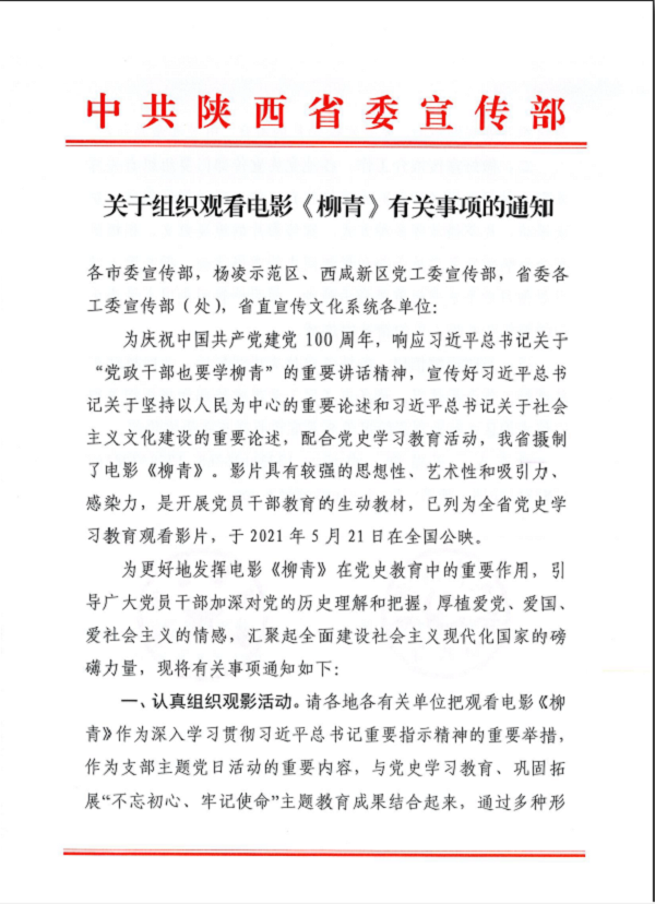 中共陜西省委宣傳部關(guān)于組織觀看電影《柳青》有關(guān)事項(xiàng)的通知