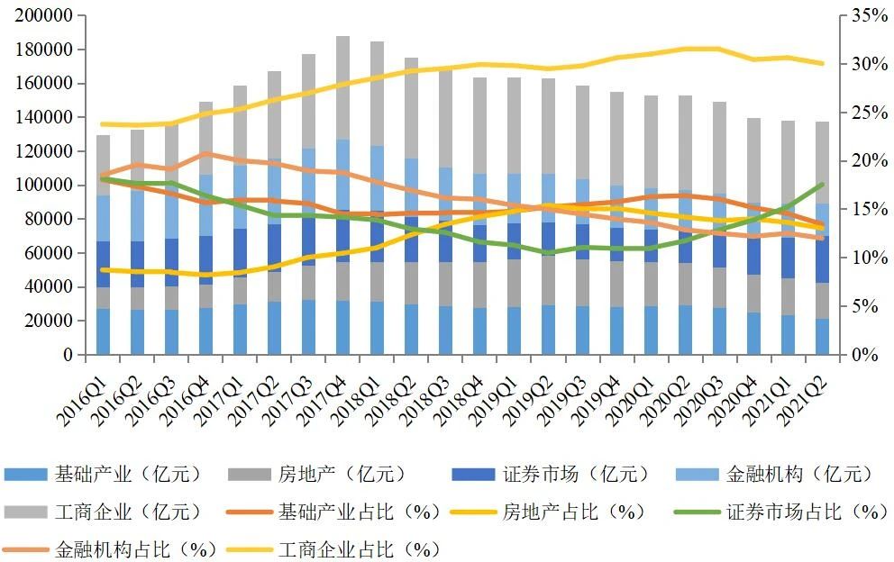 截至2021年2季度末,資金信托規(guī)模為15.97萬億元,同比下降9.56%。截至2021年2季度末,從資金信托在五大領(lǐng)域占比來看,排序分別是工商企業(yè)(30.00%)、證券市場(17.52%)、基礎(chǔ)產(chǎn)業(yè)(13.42%)、房地產(chǎn)業(yè)(13.01%)、金融機(jī)構(gòu)(11.97%)。