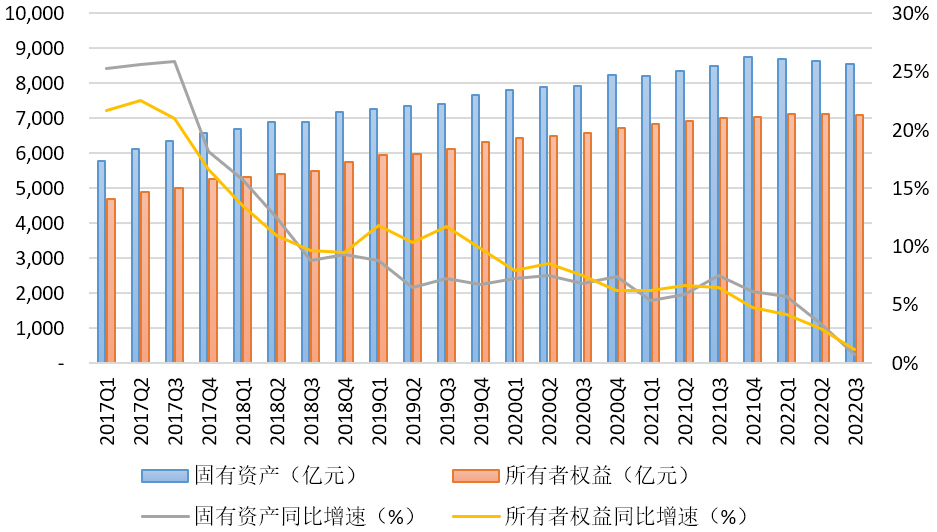 一是行業(yè)資本實(shí)力保持穩(wěn)定。從固有資產(chǎn)總額來(lái)看,3季度末達(dá)到了8562.88億元,同比略增59.32億元,增幅0.70%;環(huán)比略有下降0.89%。從所有者權(quán)益總額來(lái)看,2022年3季度末達(dá)到了7087.25億元,同比增長(zhǎng)81.18億元,增幅1.16%,環(huán)比下降0.56%。行業(yè)固有資產(chǎn)總額、所有者權(quán)益總額自2010年以來(lái)持續(xù)保持正增長(zhǎng),但從2021年3季度開(kāi)始季度增速明顯回落,2022年3季度則進(jìn)一步收窄,且環(huán)比數(shù)據(jù)出現(xiàn)下滑,這也反映出當(dāng)前行業(yè)發(fā)展轉(zhuǎn)型過(guò)程中出現(xiàn)盈利能力下降導(dǎo)致資本積累減少、投資吸引力減弱導(dǎo)致增資活躍度降低等挑戰(zhàn)。