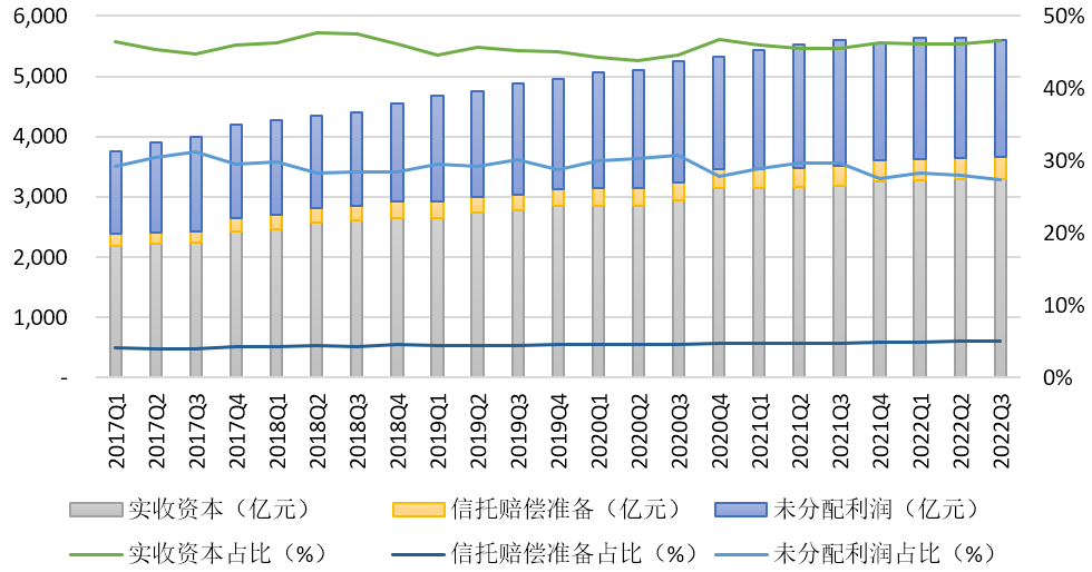 二是所有者權(quán)益內(nèi)部結(jié)構(gòu)基本保持穩(wěn)定。實(shí)收資本一直是所有者權(quán)益中最主要組成部分,截至2022年3季度末,全行業(yè)實(shí)收資本為3299.79億元,同比增長(zhǎng)112.58億元,增幅3.53%,環(huán)比增長(zhǎng)0.46%,在所有者權(quán)益中的占比達(dá)到了46.56%,同比提升1.07個(gè)百分點(diǎn)。3季度末未分配利潤(rùn)達(dá)到1943.39億元,同比下降138.87億元,降幅6.67%,環(huán)比下降2.35%,與部分機(jī)構(gòu)通過(guò)未分配利潤(rùn)轉(zhuǎn)增資本和現(xiàn)金分紅有關(guān),在所有者權(quán)益中占比27.42%,同比降低2.3個(gè)百分點(diǎn)。信托賠償準(zhǔn)備保持較快增長(zhǎng),3季度末規(guī)模為355.35億元,同比增長(zhǎng)25.69億元,增幅7.79%,環(huán)比略降2.32%,在所有者權(quán)益中占比為5.01%,同比上升了0.31個(gè)百分點(diǎn)。