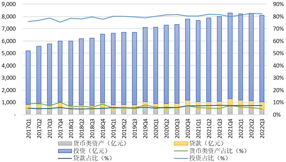 三是固有資產(chǎn)中投資運(yùn)用方式進(jìn)一步占據(jù)主導(dǎo)。2022年3季度末固有資產(chǎn)通過(guò)投資方式運(yùn)用的規(guī)模達(dá)到7041.78億元,同比增長(zhǎng)108.76億元,增幅1.57%,環(huán)比降低1.06%,占比達(dá)到82.24%,同比進(jìn)一步提升0.71個(gè)百分點(diǎn),且2022年連續(xù)3個(gè)季度的占比均保持在80%以上。貸款方式運(yùn)作的規(guī)模為628.73億元,同比下降22.58億元,降幅3.47%,環(huán)比下降1.27%,占比為7.34%,同比略降0.32個(gè)百分點(diǎn),相對(duì)占比自2018年2季度跌至谷底以后總體保持小幅回升態(tài)勢(shì)。貨幣類(lèi)資產(chǎn)規(guī)模為412.53億元,同比下降2.88%,環(huán)比下降16.40%,占比4.82%,同比略降0.18個(gè)百分點(diǎn),占比總體呈現(xiàn)持續(xù)下降態(tài)勢(shì)。